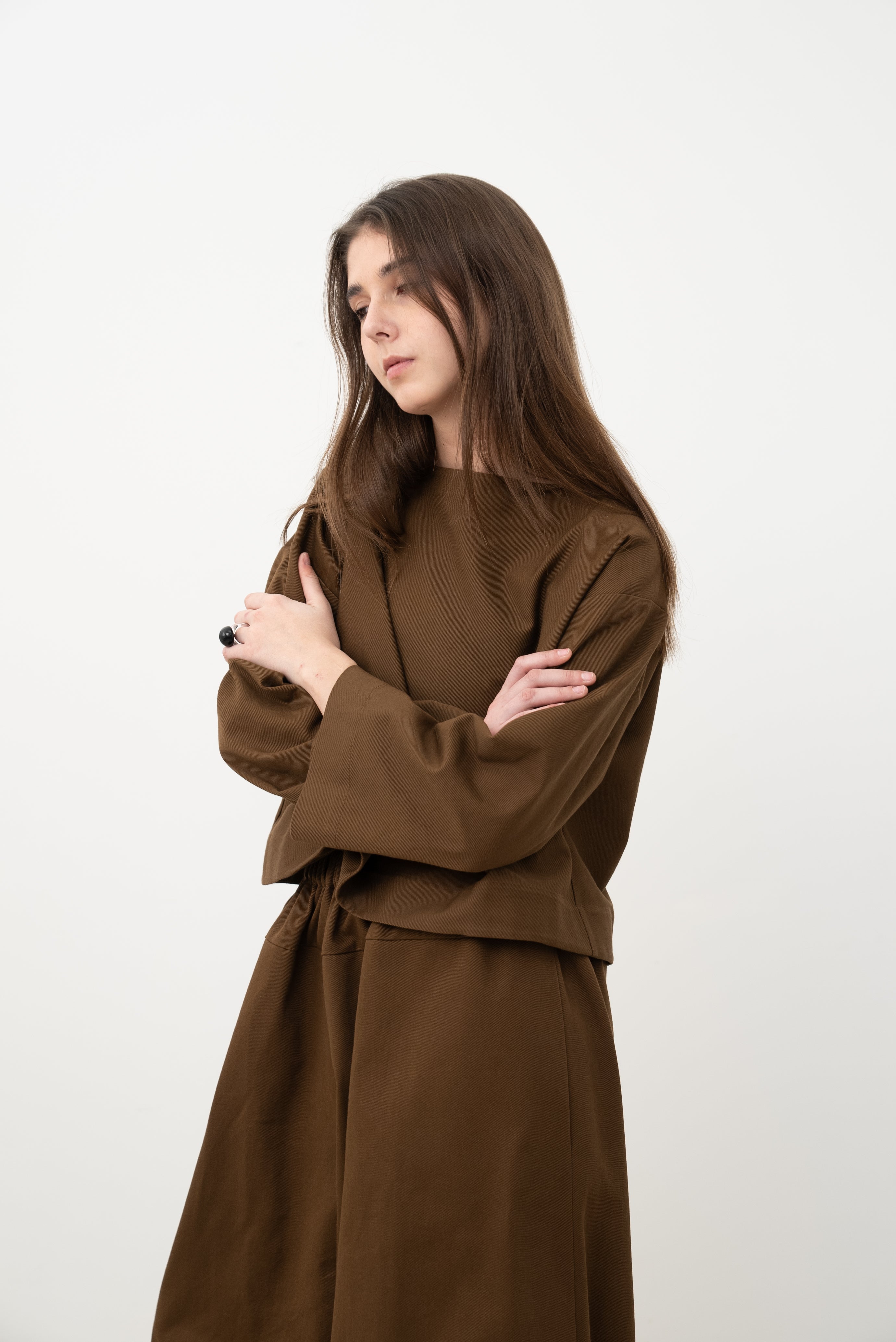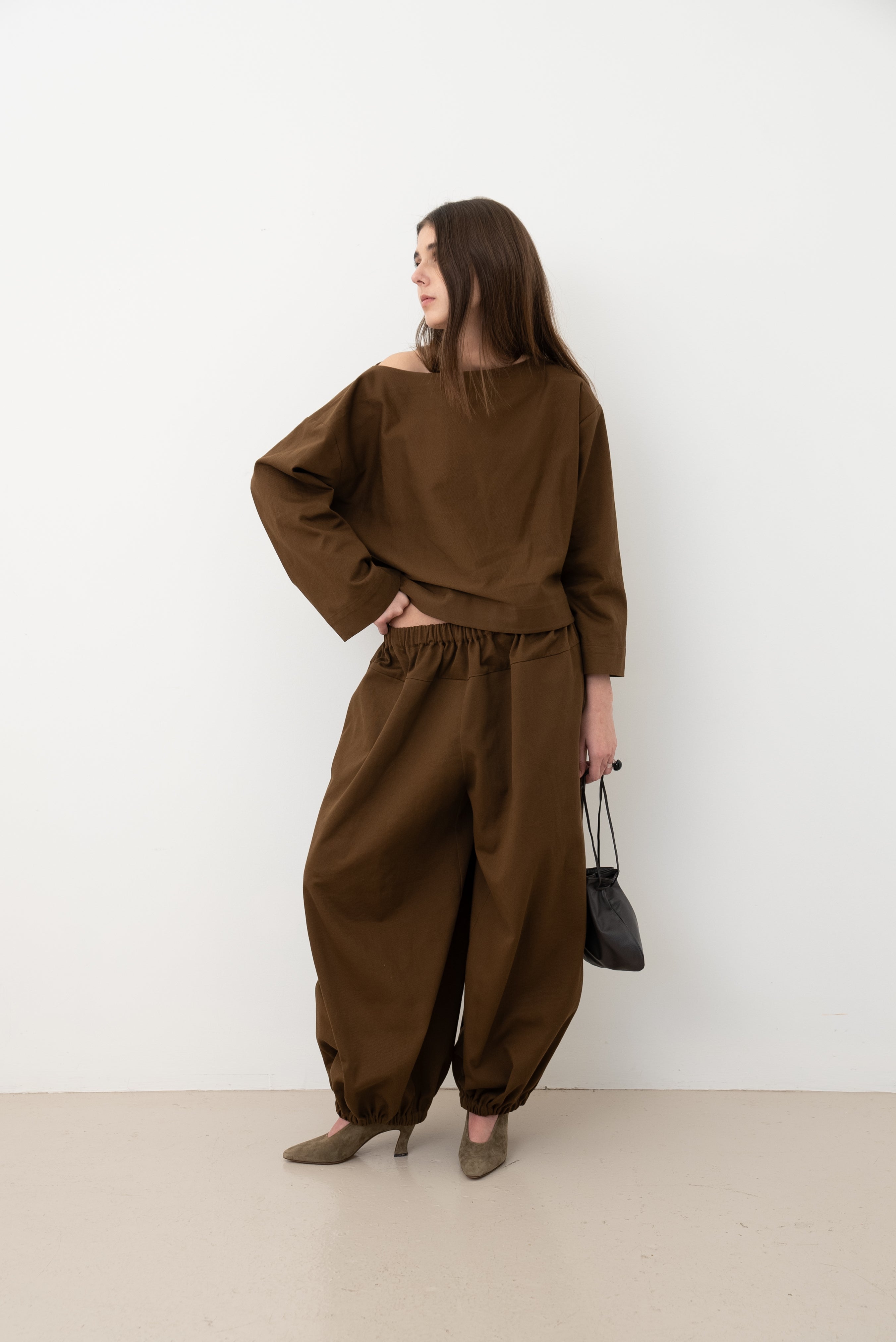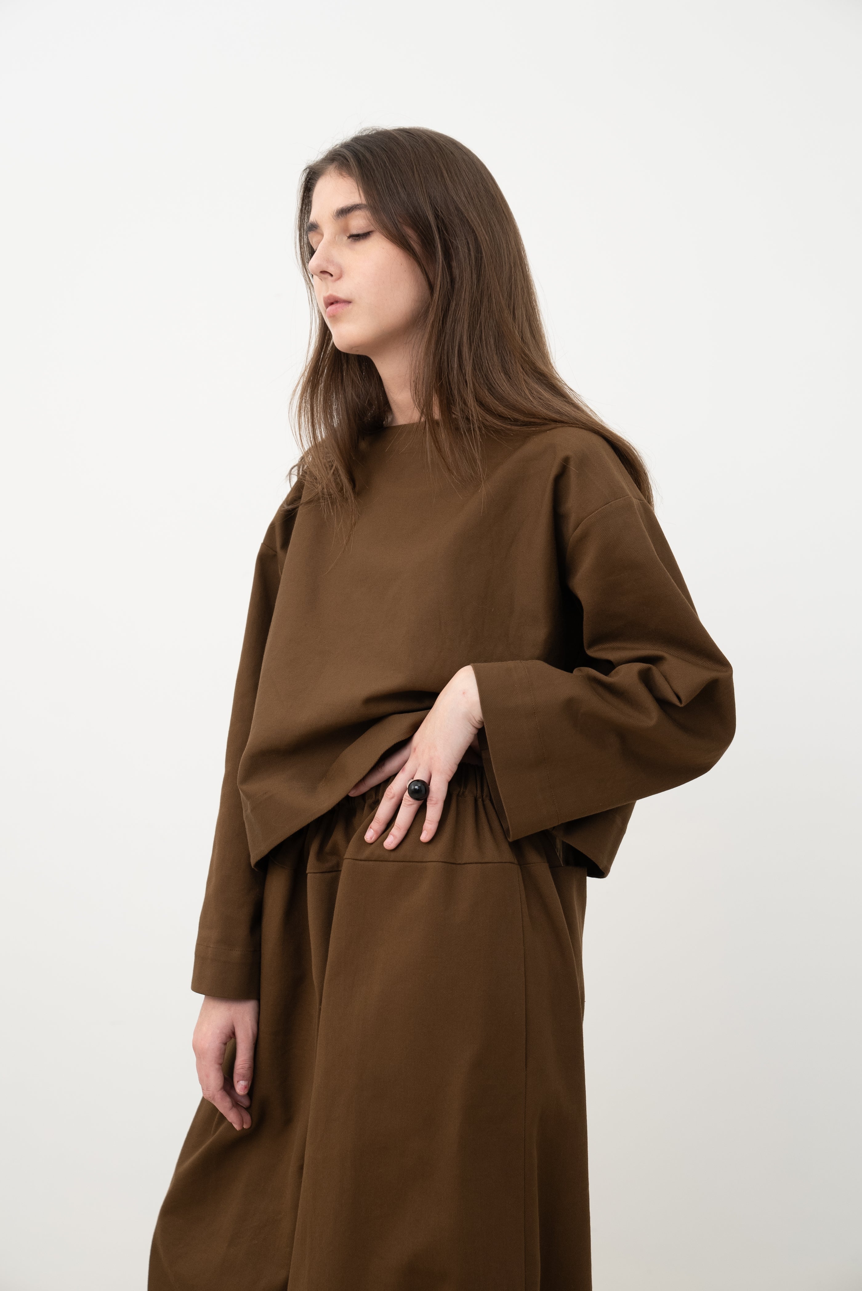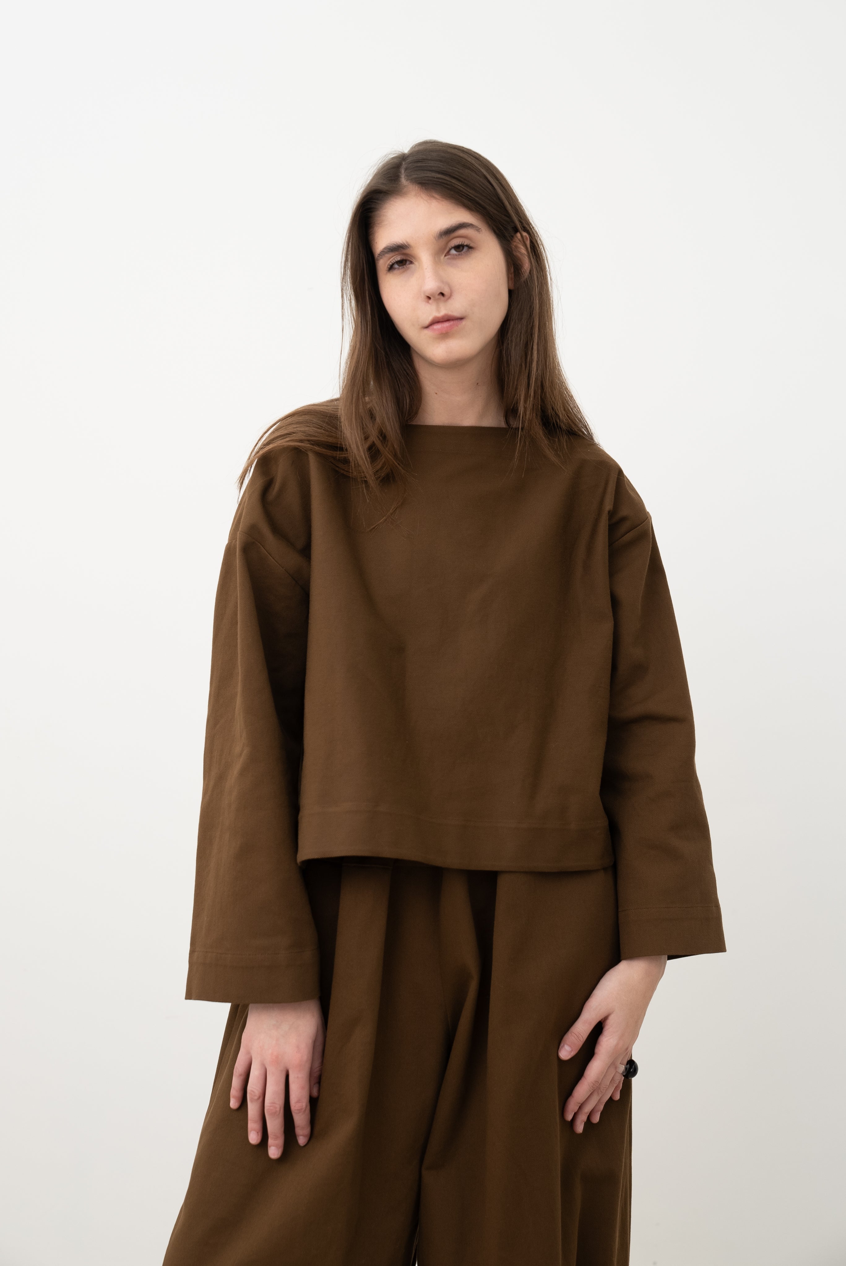 Description: A boxy boatneck top featuring a dropped shoulder and oversized drape.
