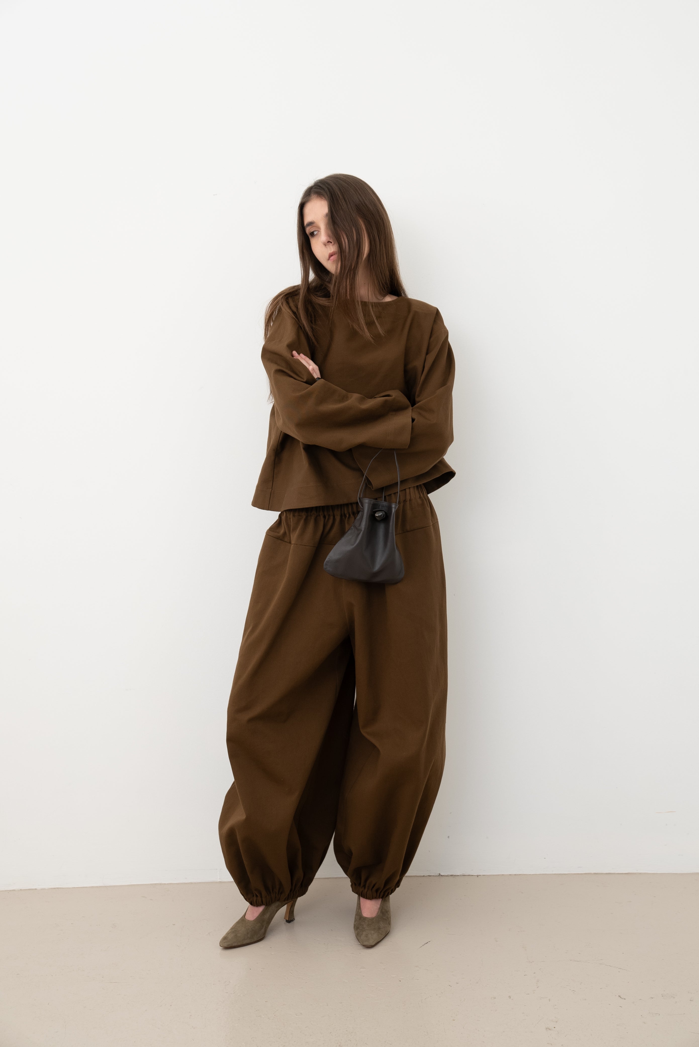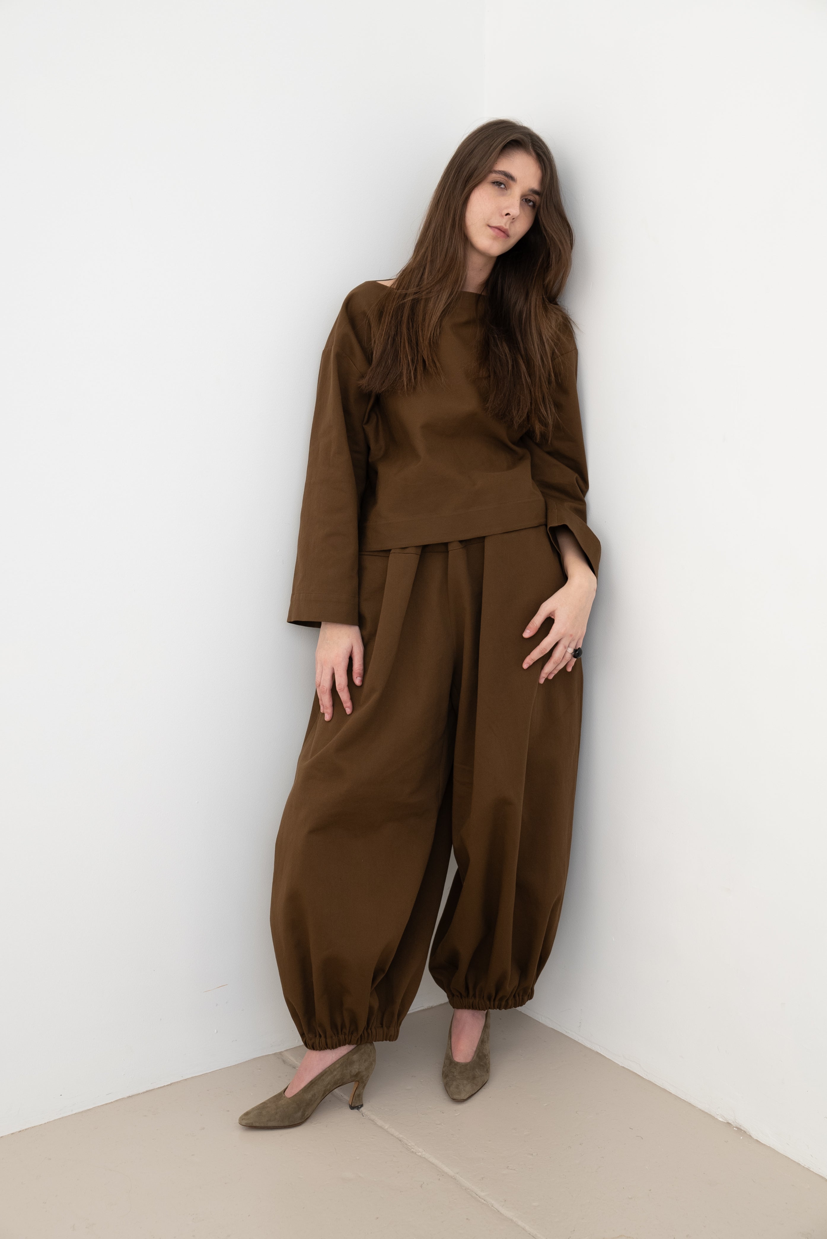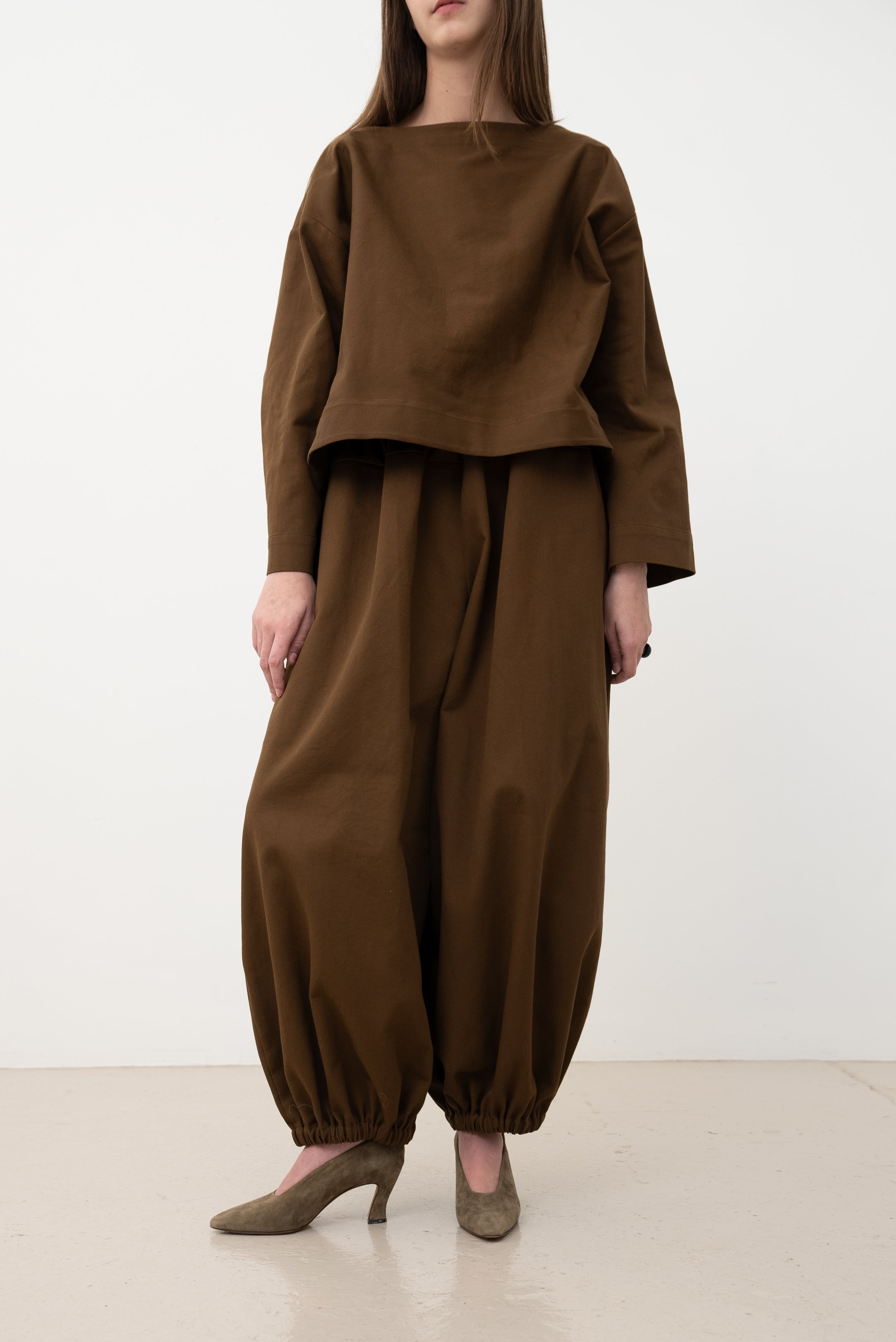 Description: A boxy boatneck top featuring a dropped shoulder and oversized drape.