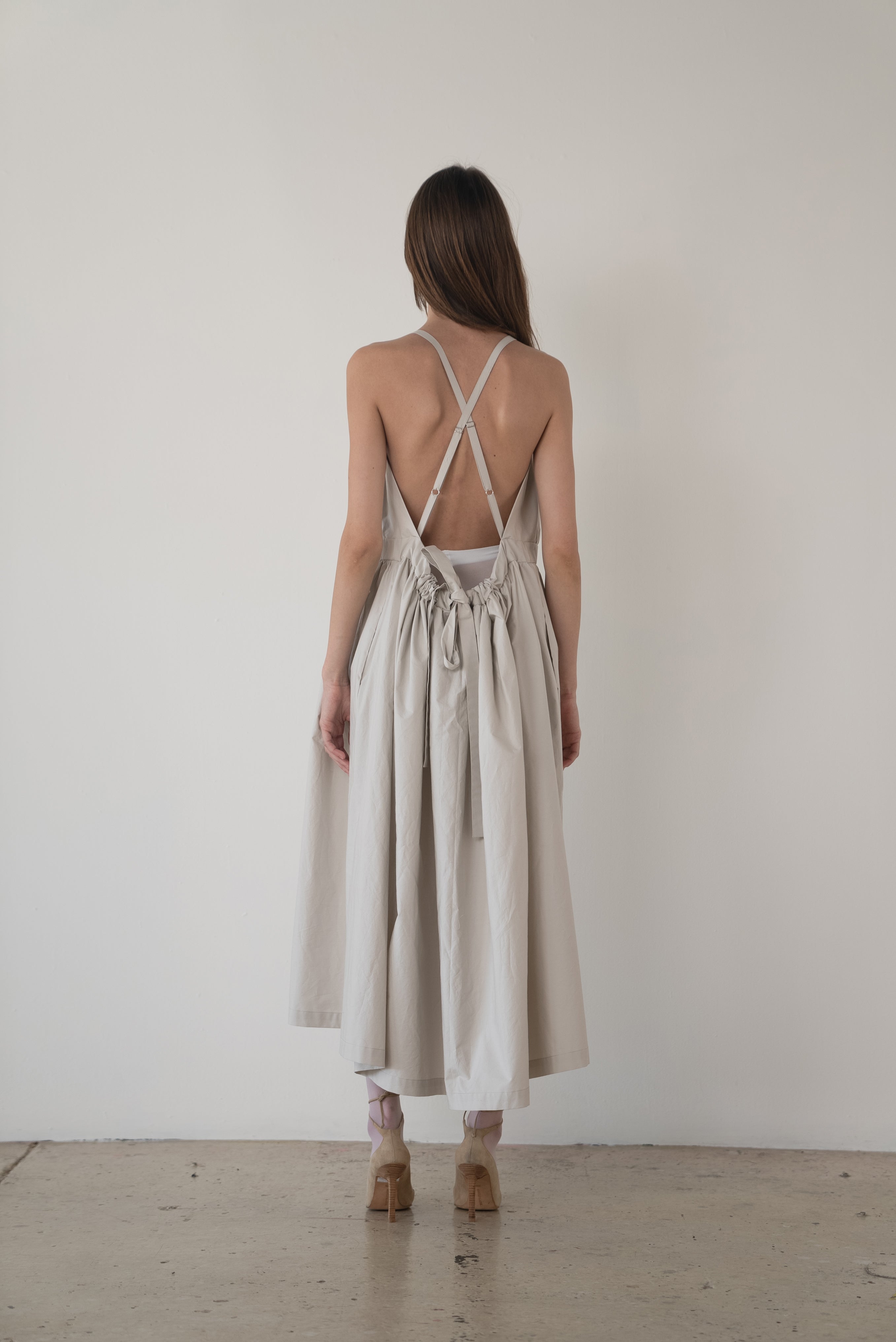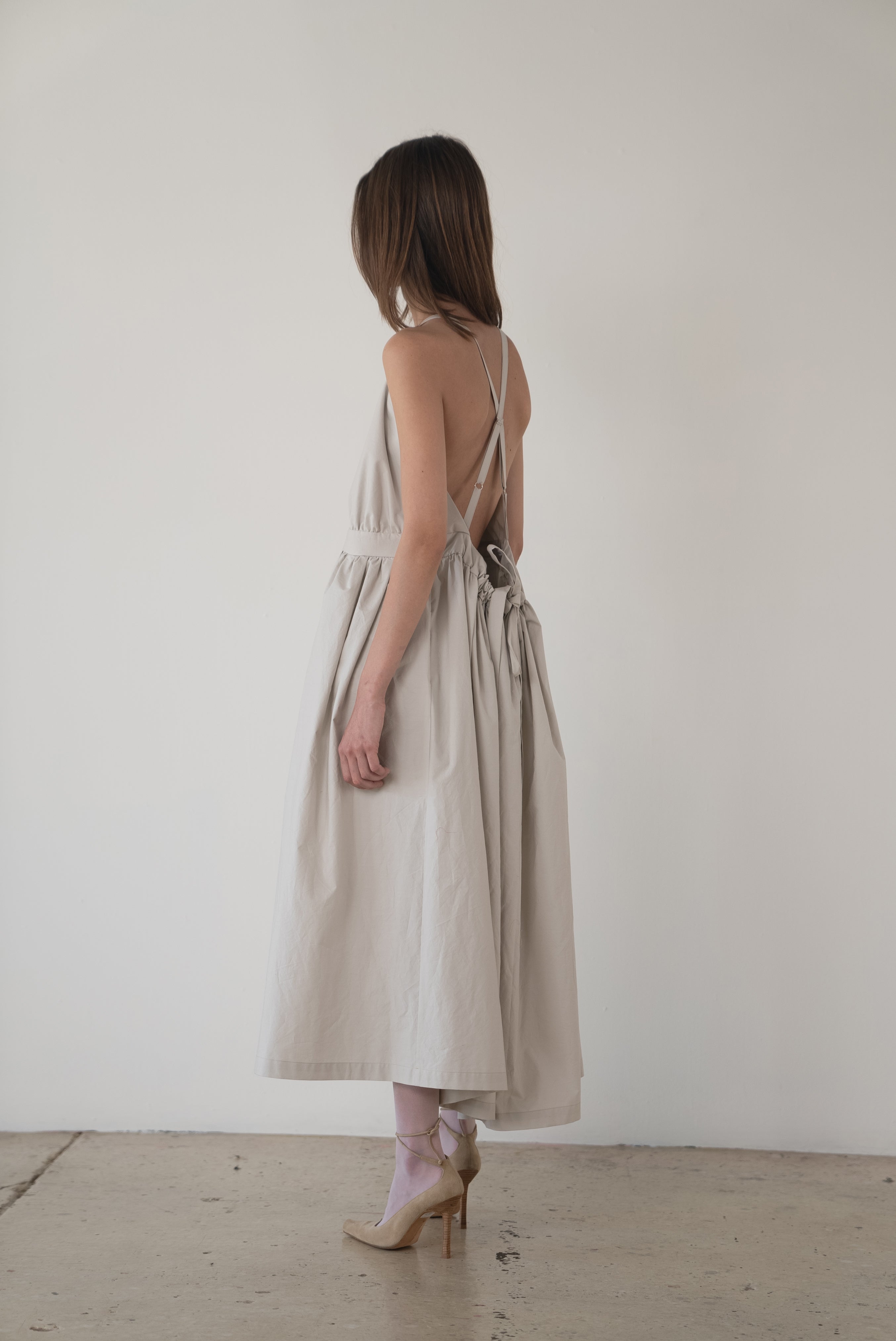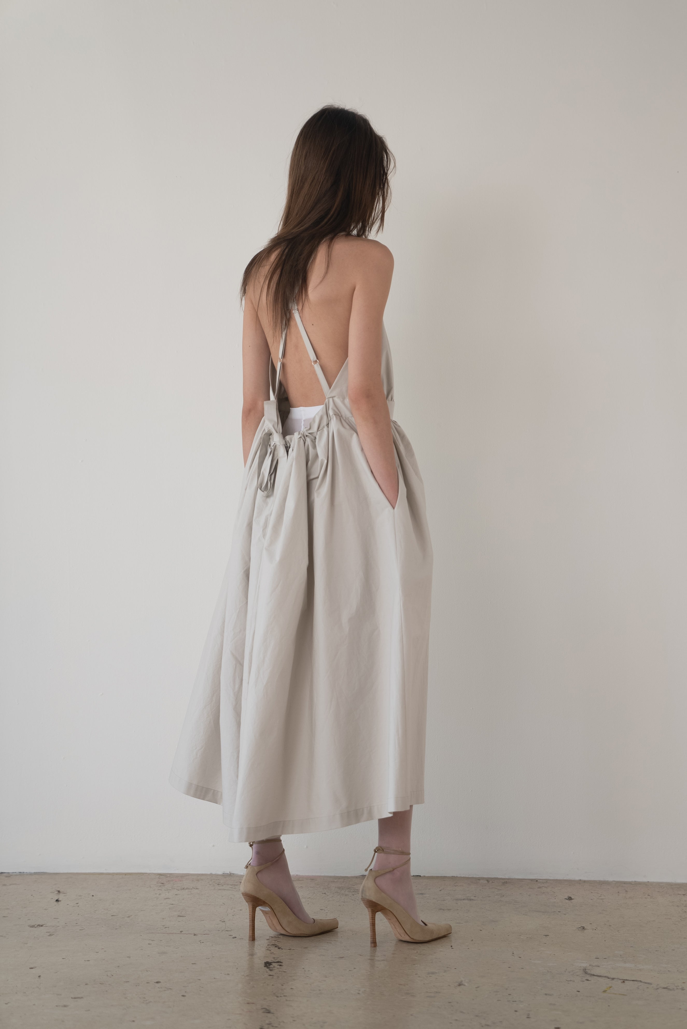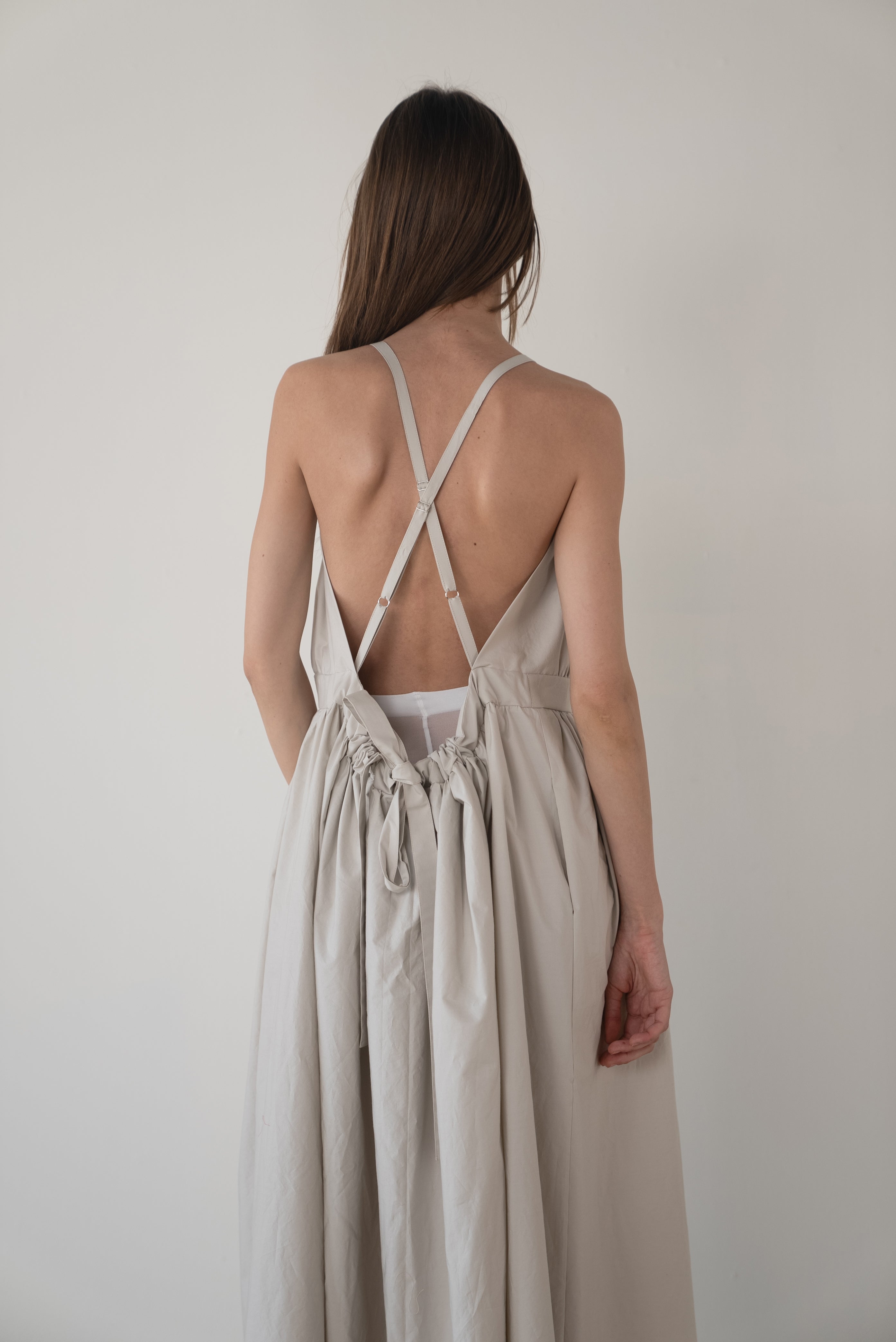 Description: A fully gathered dress with deep side seam pockets, adjustable straps, and a drawstring low-cut back.