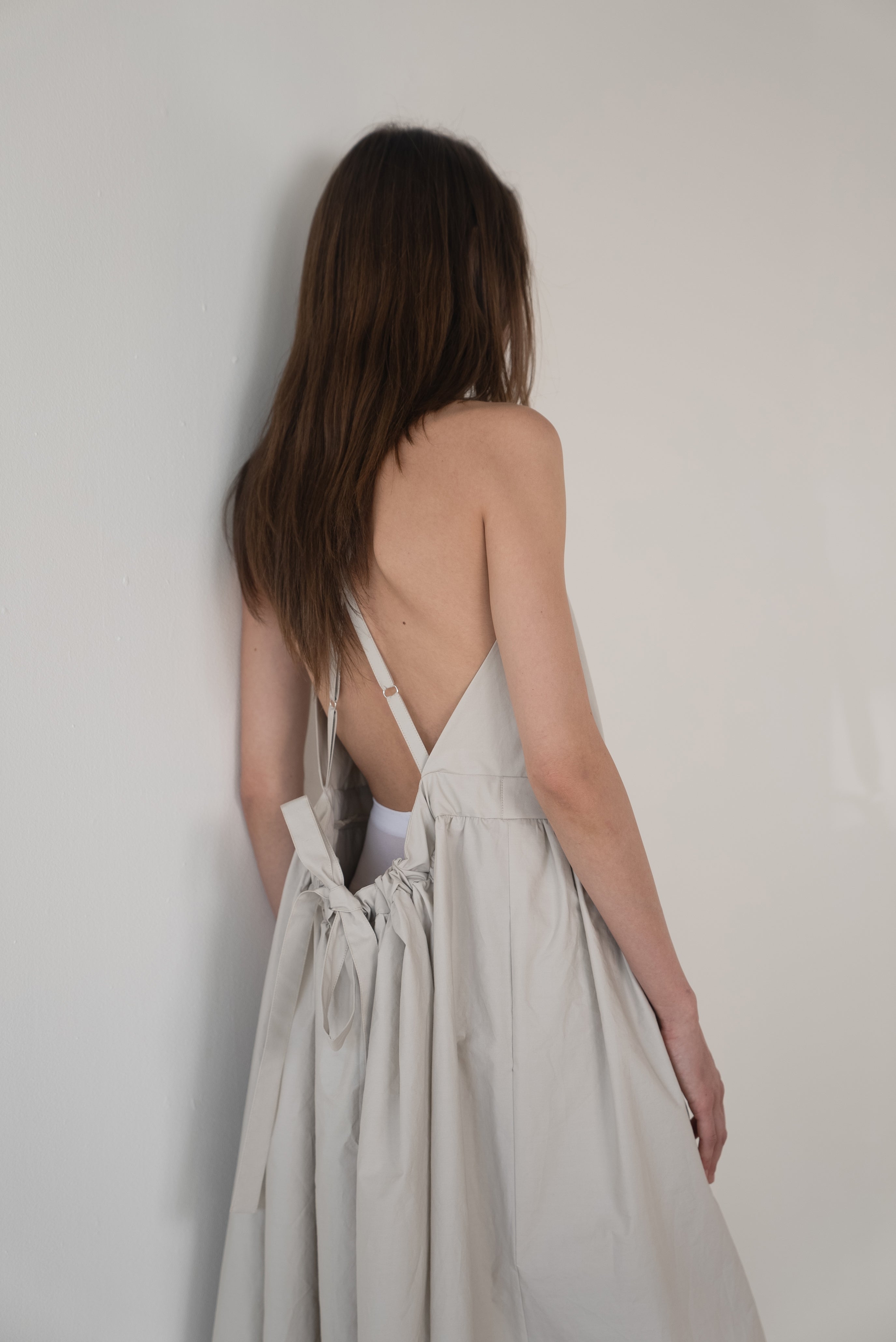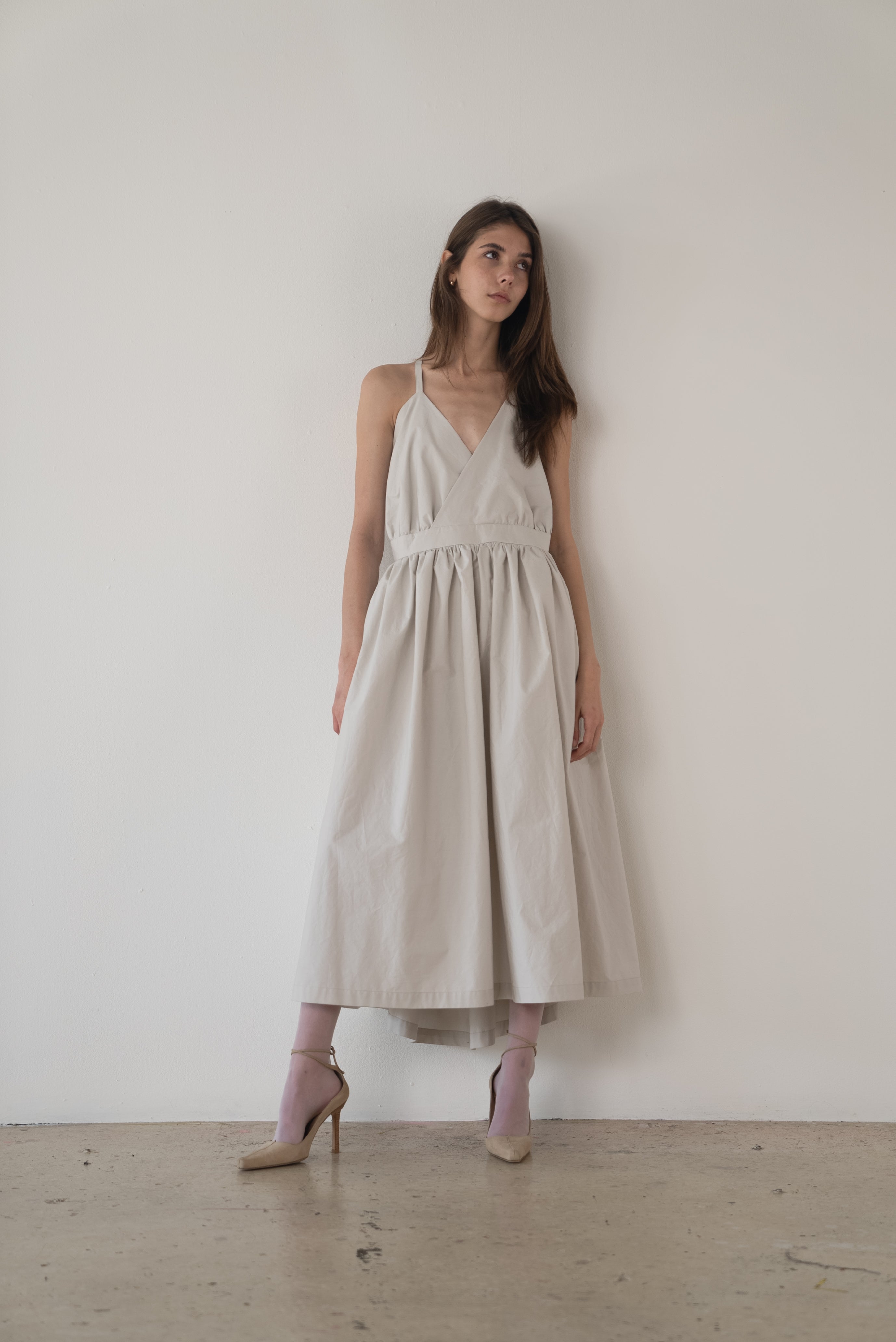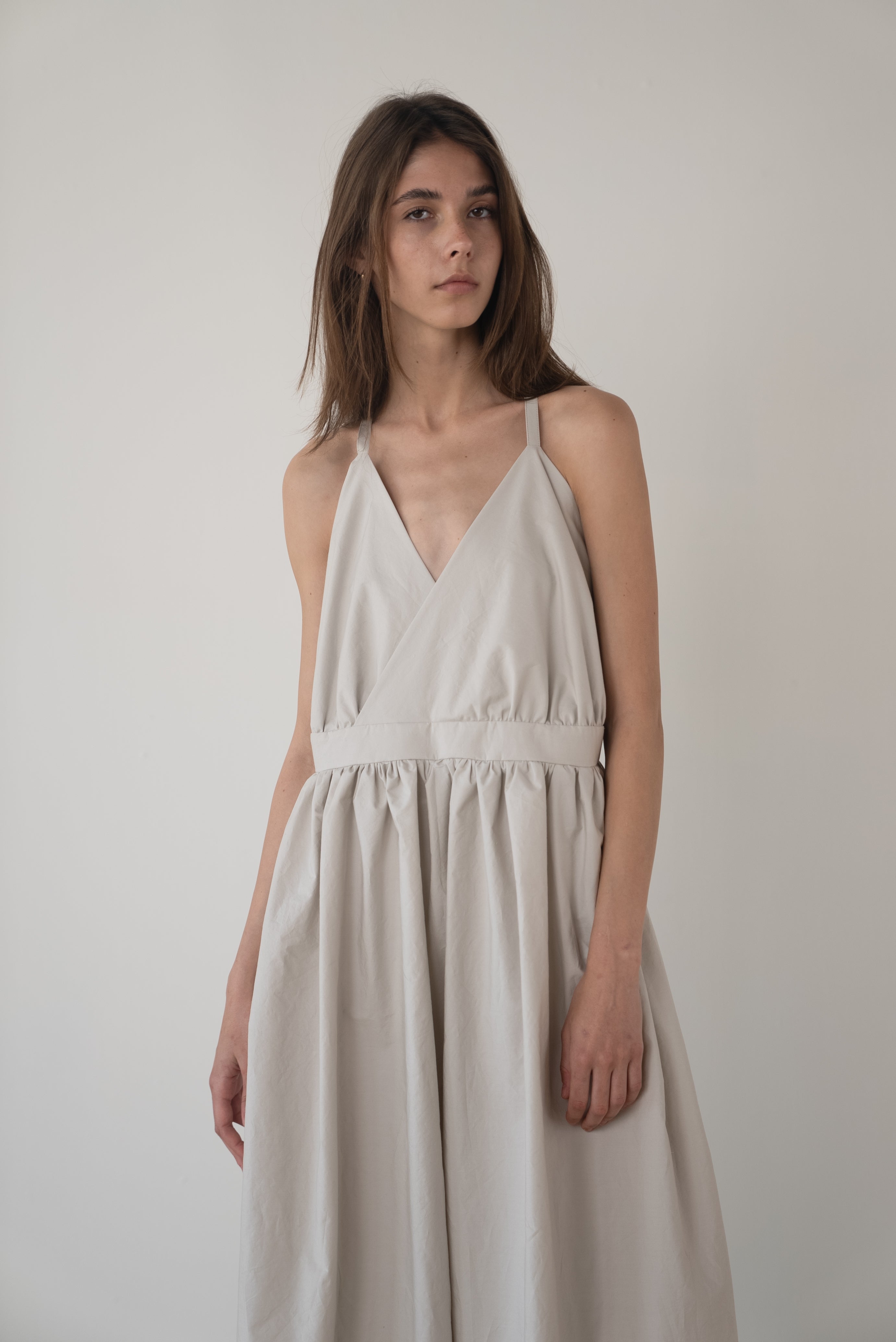 Description: A fully gathered dress with deep side seam pockets, adjustable straps, and a drawstring low-cut back.