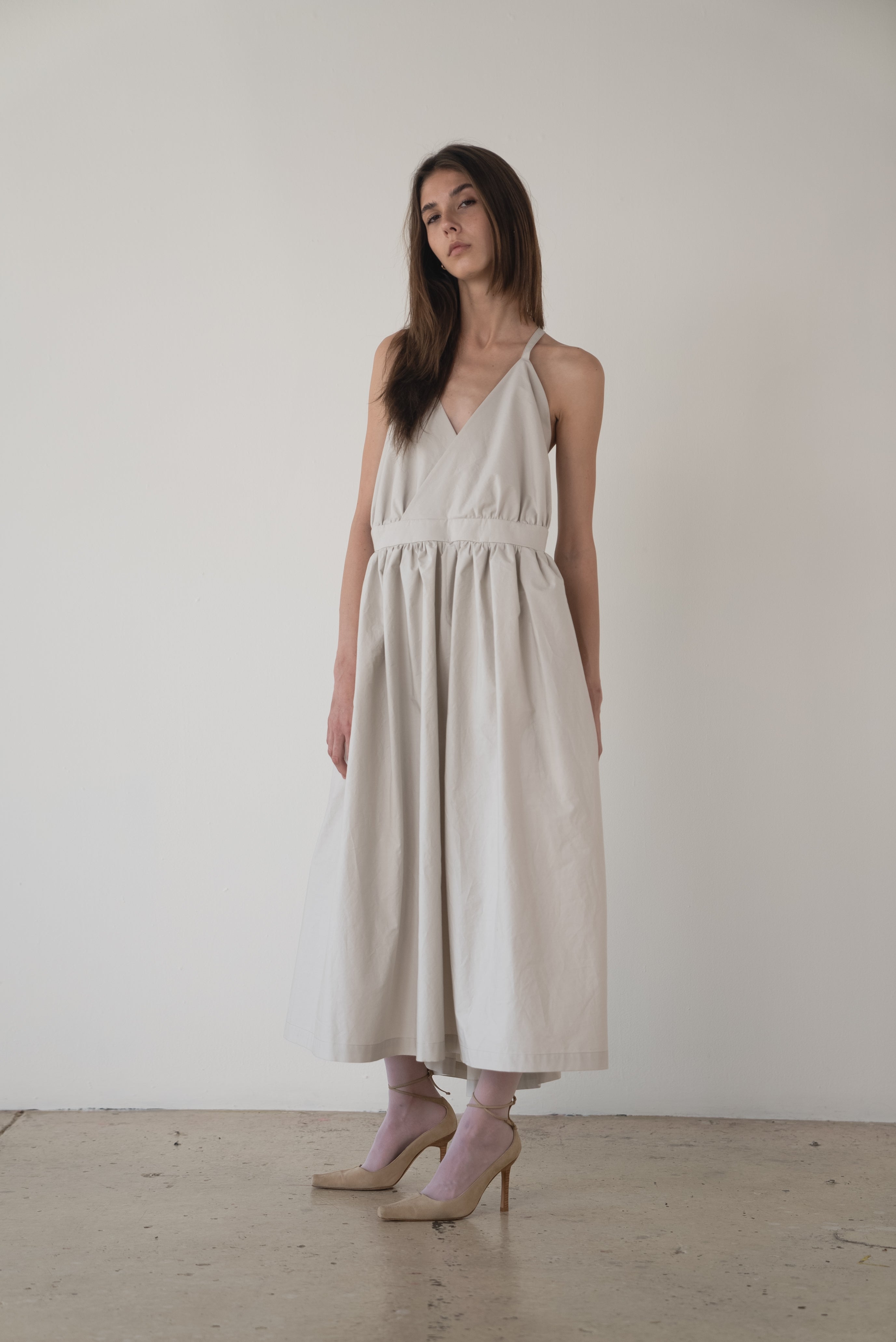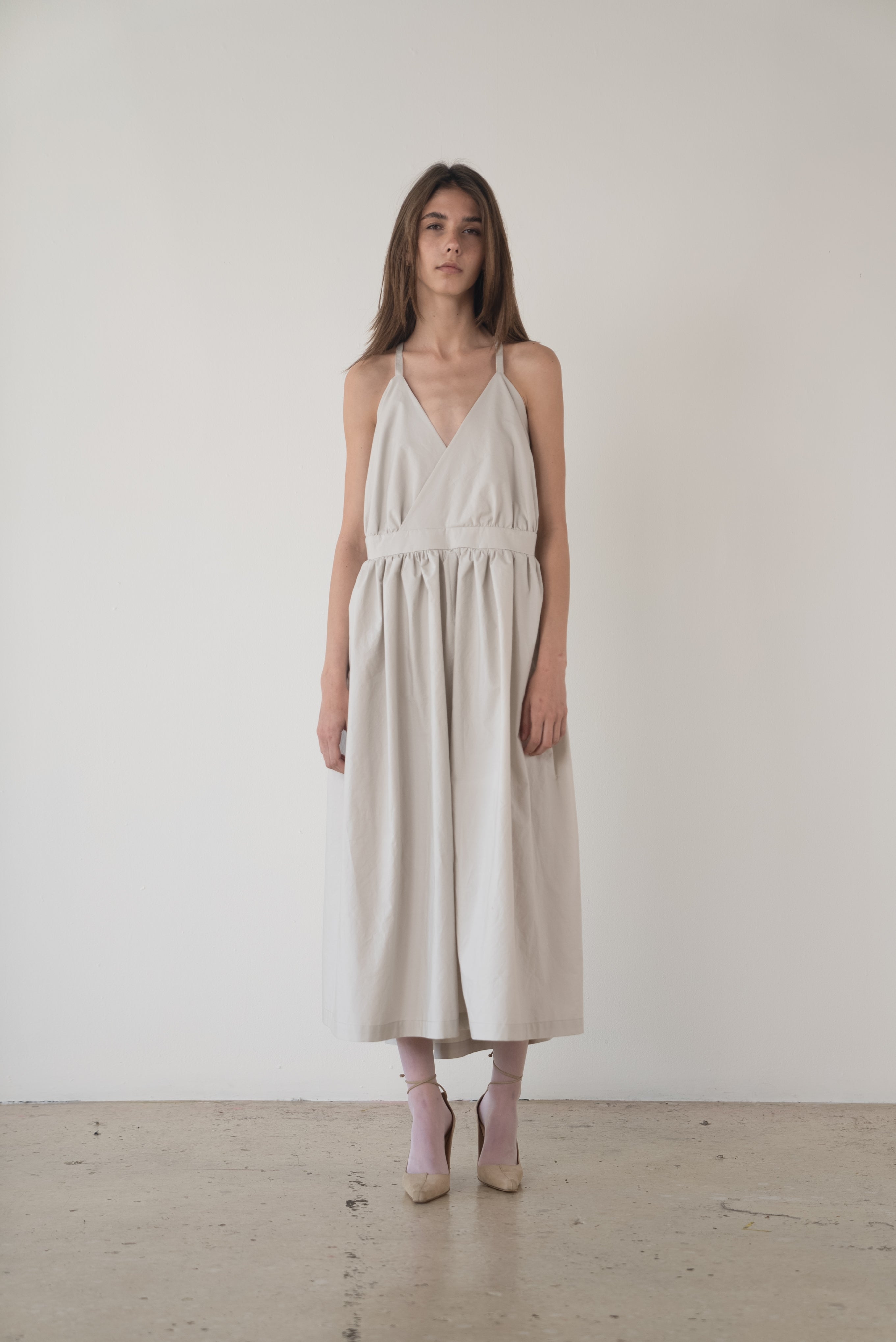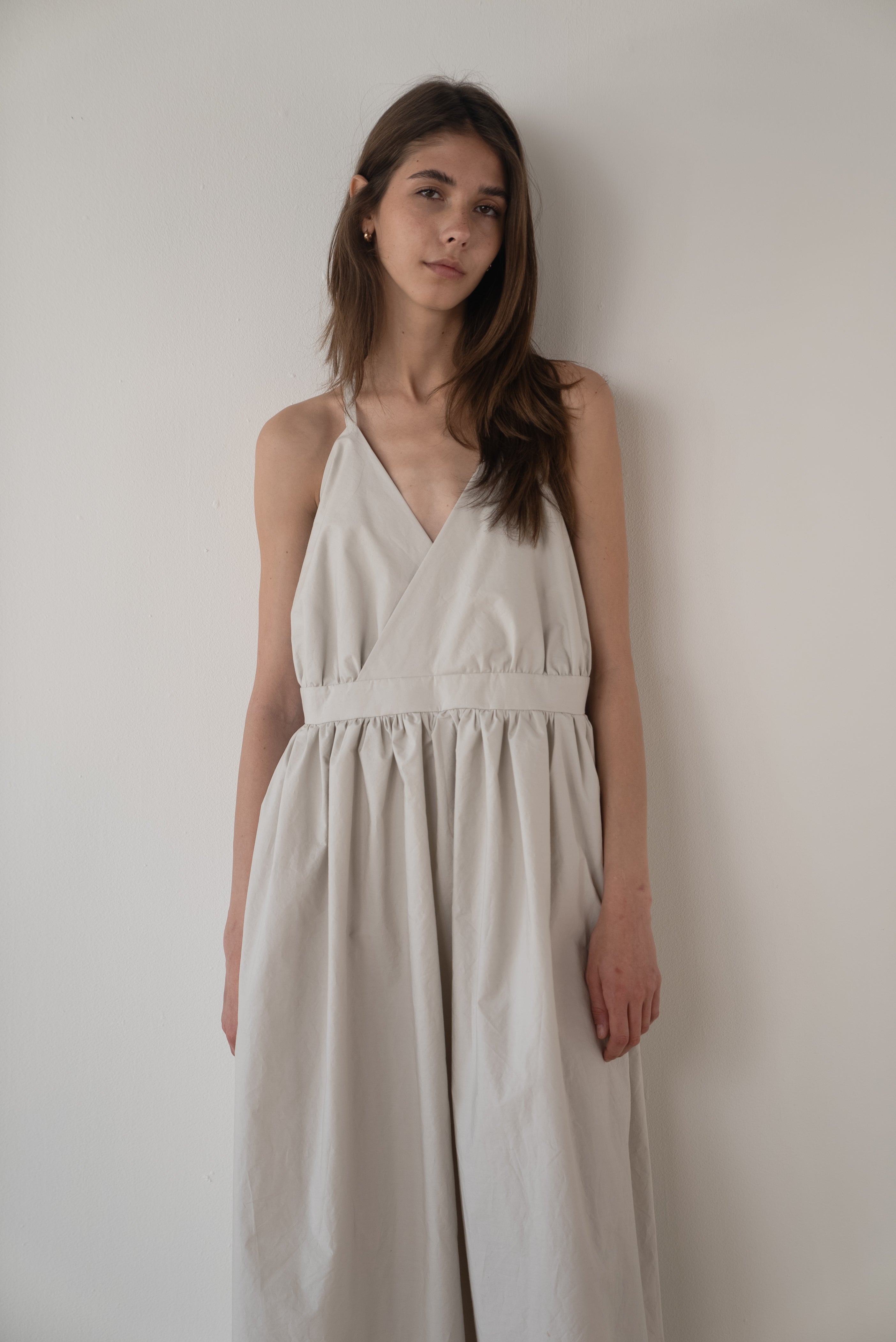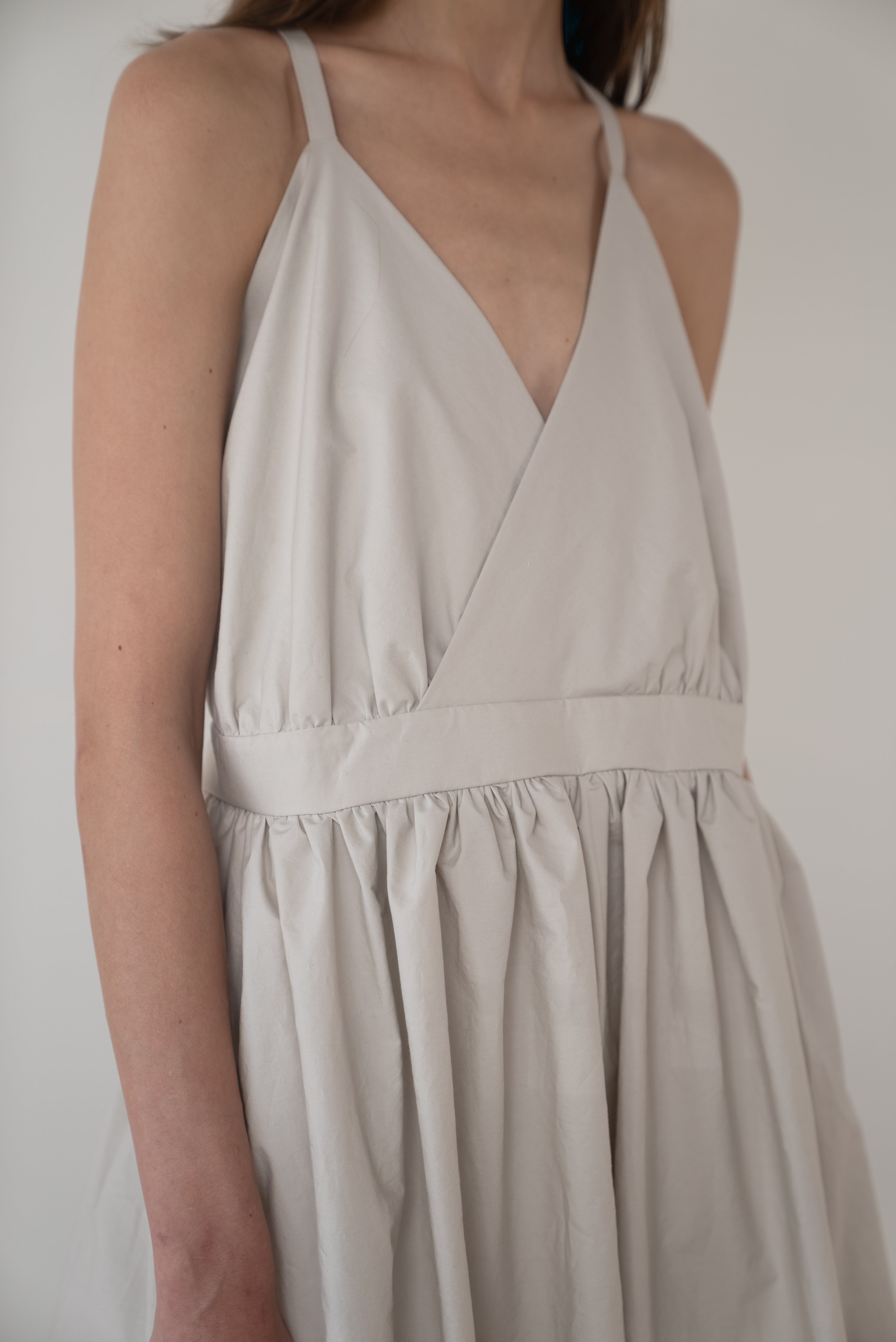 Description: A fully gathered dress with deep side seam pockets, adjustable straps, and a drawstring low-cut back.