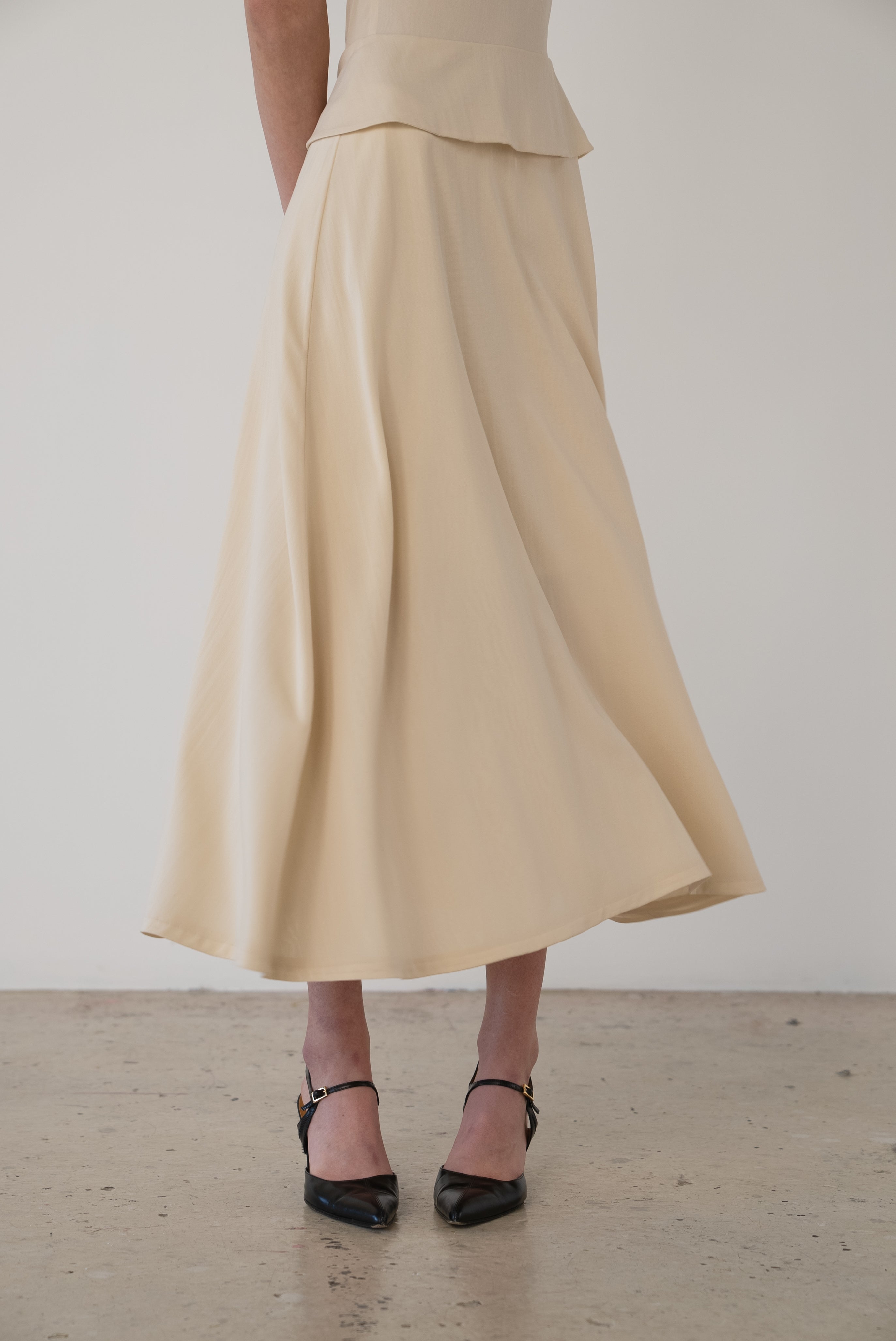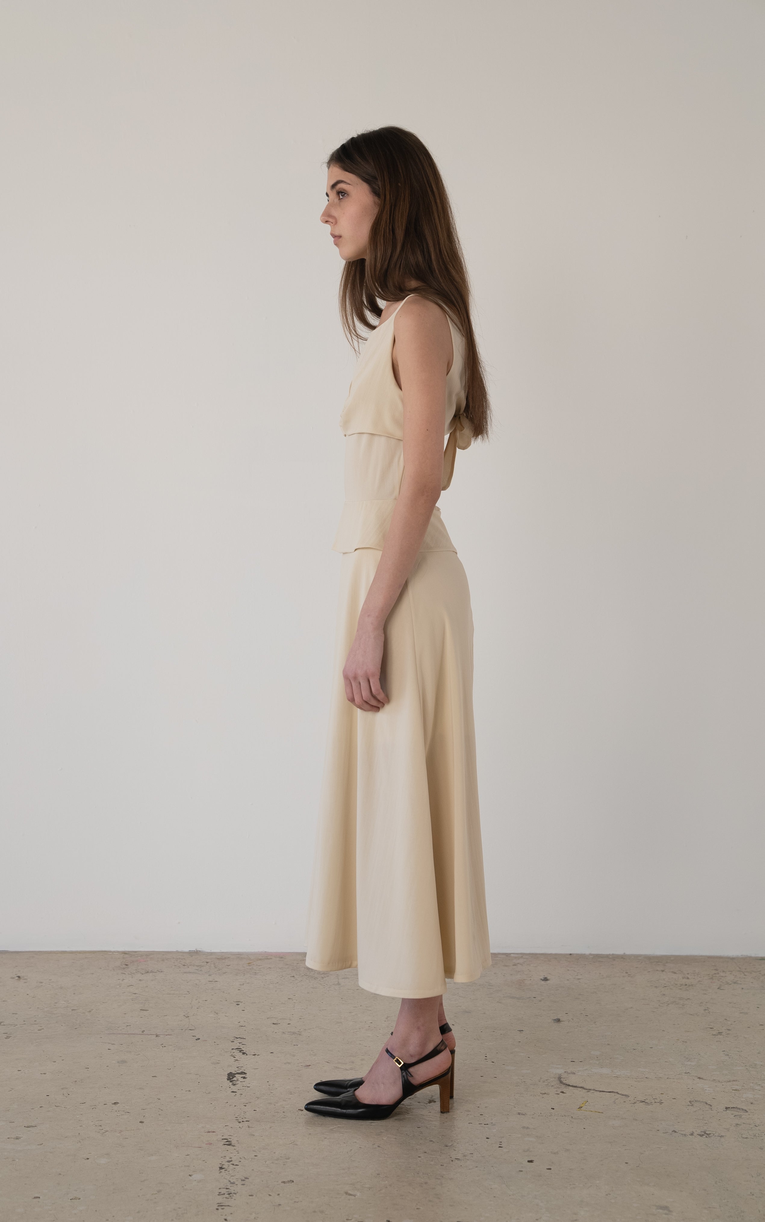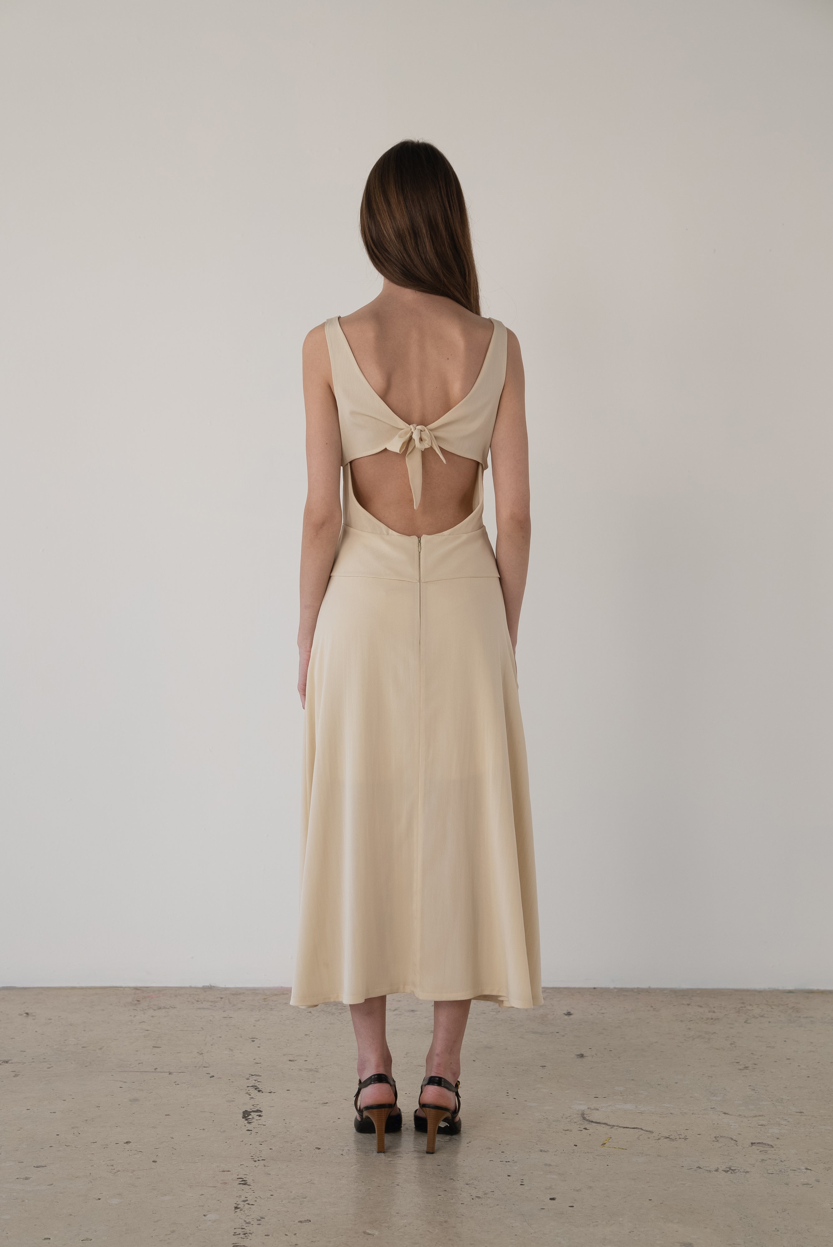 Description: A stretch silk chiffon dress featuring an open back, flared skirt, and overlays at the waist and bust. Back zip closure. Fully lined with the self fabric.