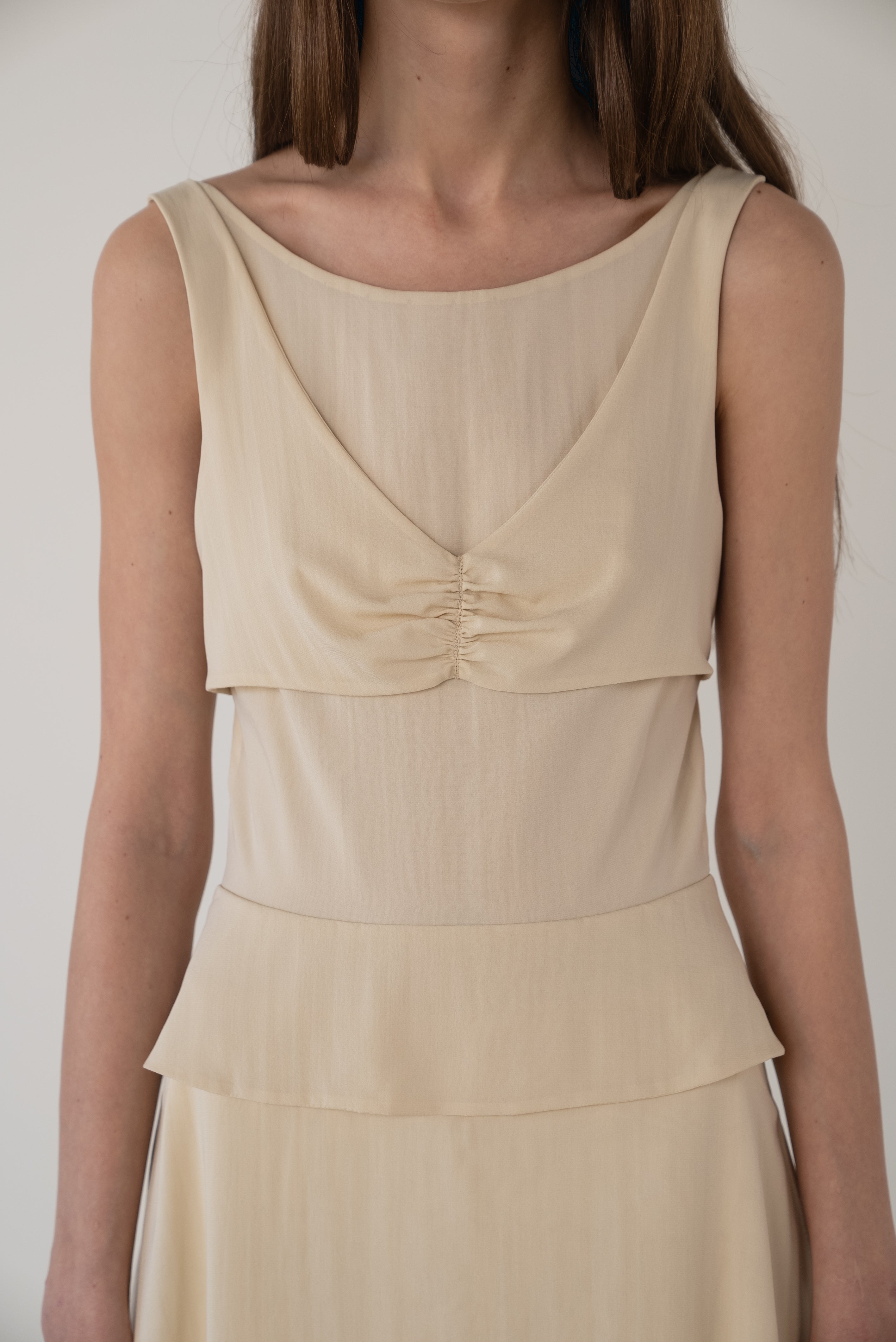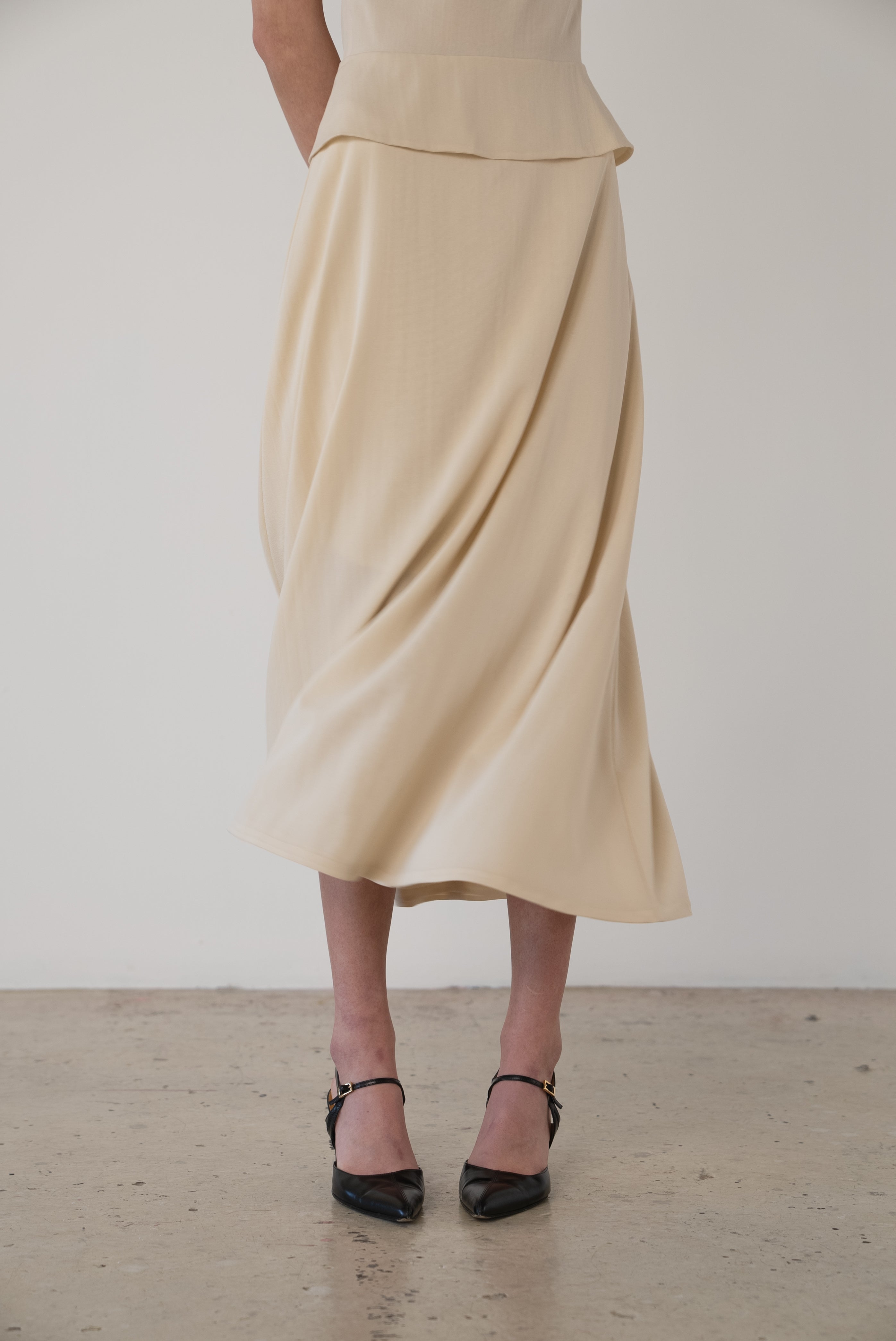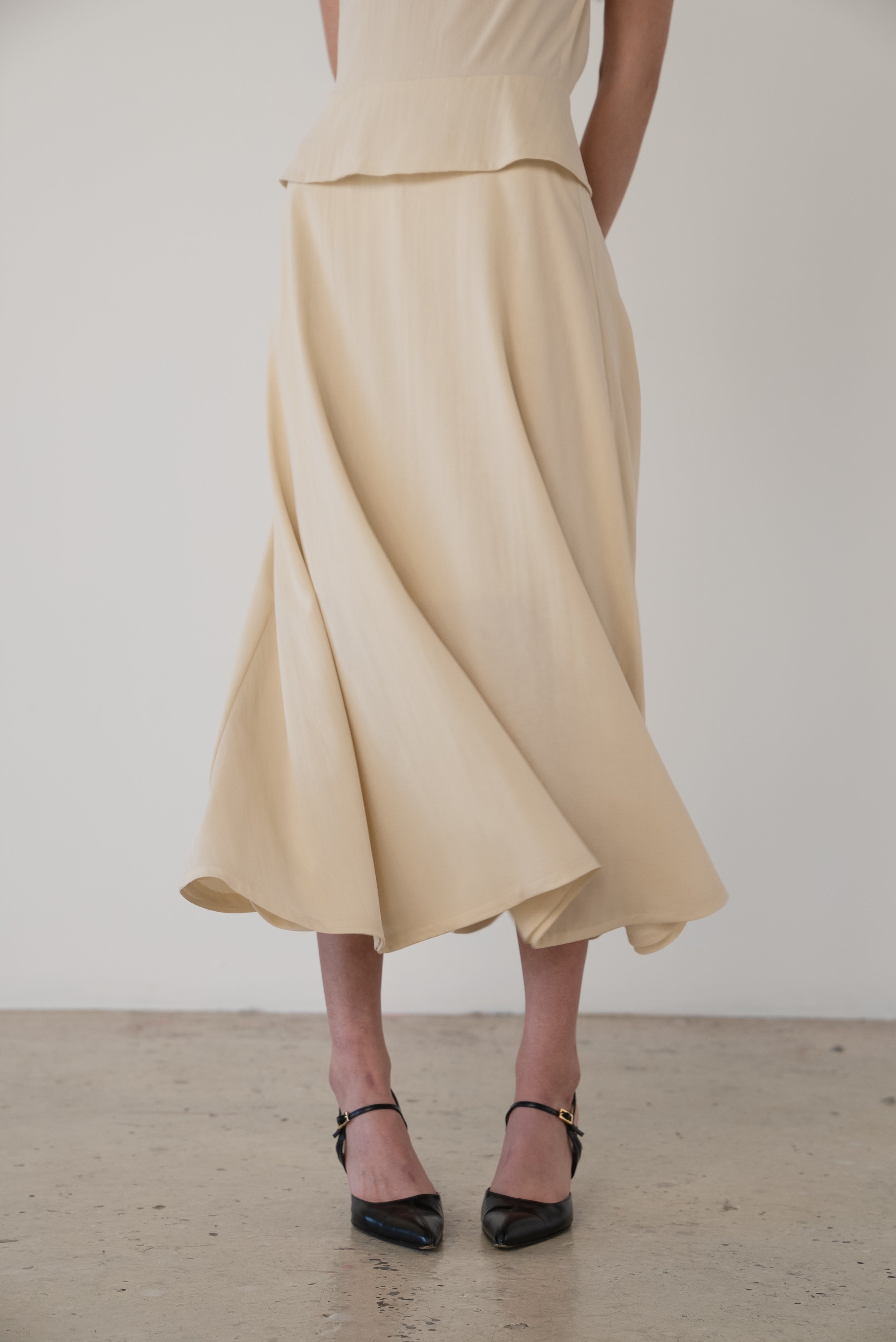 Description: A stretch silk chiffon dress featuring an open back, flared skirt, and overlays at the waist and bust. Back zip closure. Fully lined with the self fabric.